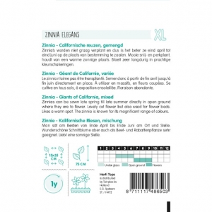 Zinnia’s worden niet graag verplant en dus is het beter ze eind april tot eind juni op de plaats van bestemming te zaaien. Mooie snij- en perkplant, houdt van een warme zonnige plaats. Bloeit zeer langdurig in prachtige kleurschakeringen.