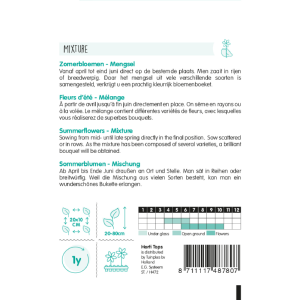 Vanaf half april tot eind mei direkt op de bestemde plaats. Men zaait in rijen of breedwerpig. Daar het mengsel uit vele verschillende soorten is samengesteld, verkrijgt u een prachtig kleurrijk bloemenboeket.