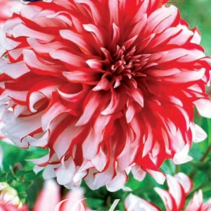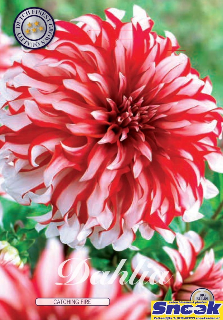 Decoratieve dahlia. wit-rood gevlamd. Hoogte 80 cm.