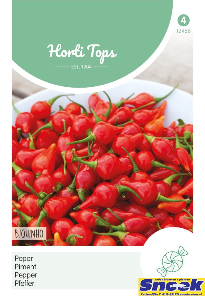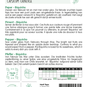 Zaaien van februari tot en met mei onder glas. De felrode vruchten lopen taps toe naar een punt zoals een omgekeerde traan. In tegenstelling van wat je een peper verwacht is ‘Biquinho’ geliefd om zijn zoetheid. Het voegt de zoete smaak toe aan elk gerecht dat je ermee kookt.