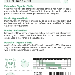 Vanaf half februari tot half maart onder glas, of vanaf half maart tot begin augustus in de vollegrond. ‘Gigante d’Italia’ is aromatischer dan gekrulde peterselie en wordt o.a. culinair gebruikt in een ‘bouquet garni’.