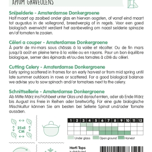 Half maart op zaaibed onder glas en hiervan oogsten, of vanaf eind maart tot augustus in de vollegrond, breedwerpig of in regels. Voor een goed biologisch evenwicht verdient het aanbeveling om naast selderie spinazie en/of tomaten te zaaien.
