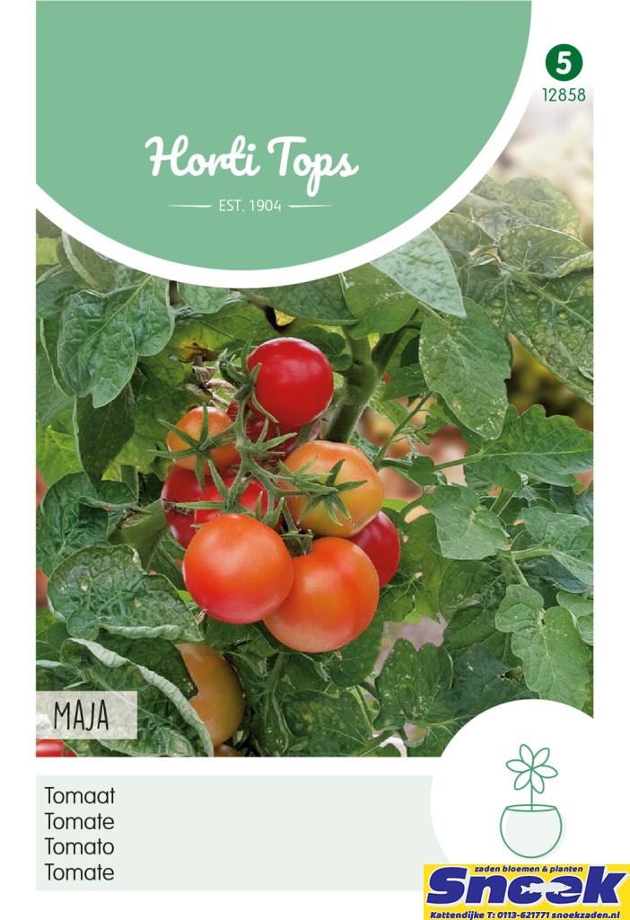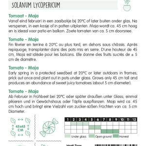 Vanaf eind februari in een zaaibakje bij 20ºC of later buiten onder glas. Na verspenen, in een kasje of in potten uitplanten. Maja wordt ca. 45 cm hoog en is ideaal voor patio en balkon. Zoete tomaten van ca. 5 cm doorsnee.