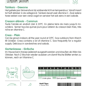 Het gehele jaar binnenshuis bij voldoende licht en temperatuur. Vanaf maart tot half oktober in de vollegrond. Tuinkers bevat veel vitamine C. Zaai iedere twee weken voor een verse oogst en serveer het ook eens in een salade.