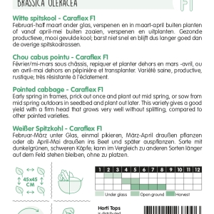 Februari-half maart onder glas, verspenen en in maart-april buiten planten of vanaf april-mei buiten zaaien, verspenen en uitplanten. Gezonde productieve, mooi gevulde kool; barst niet snel en blijft dus langer goed dan de overige spitskoolrassen. Ca.75 zaden.
