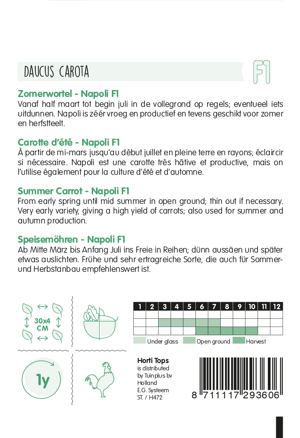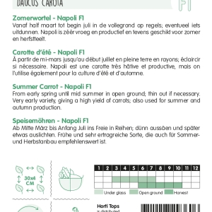 Vanaf half maart tot begin juli in de vollegrond op regels; eventueel iets uitdunnen. Napoli is zéér vroeg en productief en tevens geschikt voor zomer en herfstteelt. ca. 800 zaden.