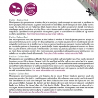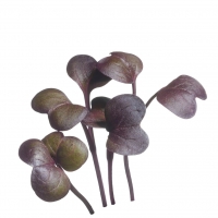 Deze micro leaves met fris-pittige smaak zijn na ca. een week oogstbaar. Opvallend mooi gekleurde microgreens, goed te combineren in salades of bij warme oosterse gerechten. Microgreens zijn groenten en kruiden, die je in een jong stadium oogst en rauw eet, te verdelen in twee groepen; Micro leaves: oogst en eet zowel het kiemblad als de stengel; de kiem. Baby leaves: oogst de scheuten en eet het jonge blad. Zaaien: strooi de zaden op grond en bedek ze met een dun laagje aarde, houd deze vochtig.
