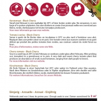 Kerstomaat - Black Cherry Vanaf eind februari in ‘n zaaibakje bij 20°C of later buiten onder glas. Na verspenen, in een kasje of in potten uitplanten.